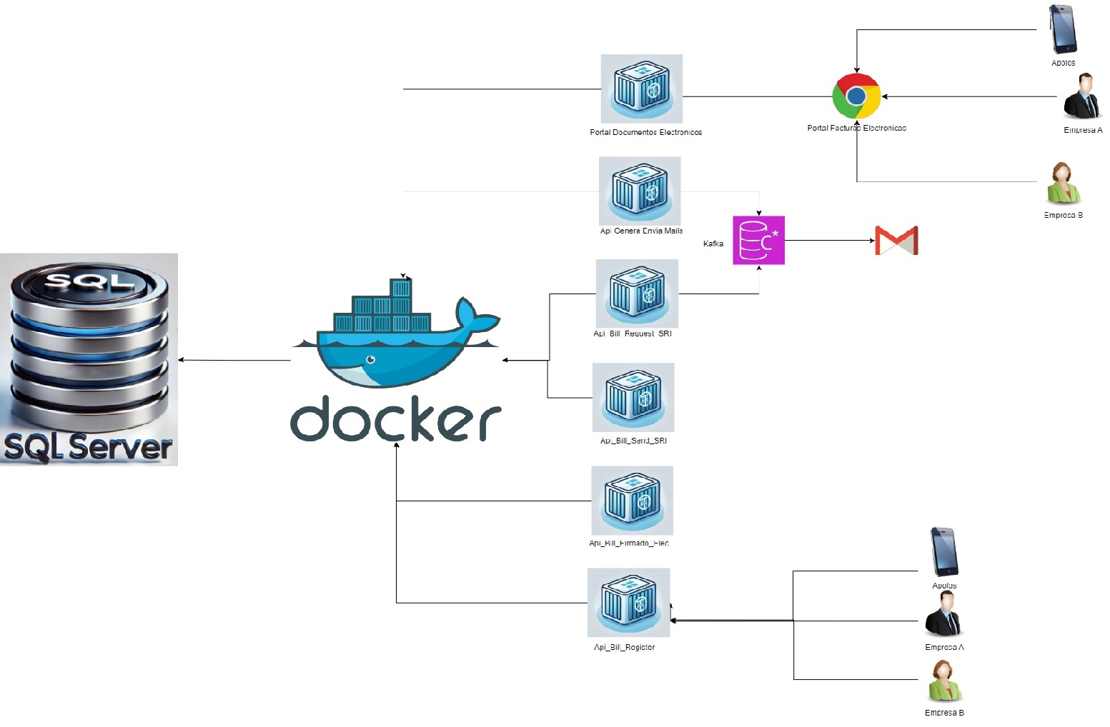 - SQL Server: Actúa como base de datos principal para almacenar los documentos electrónicos y su estado. Los contenedores interactúan directamente con esta base de datos para realizar consultas y actualizaciones.